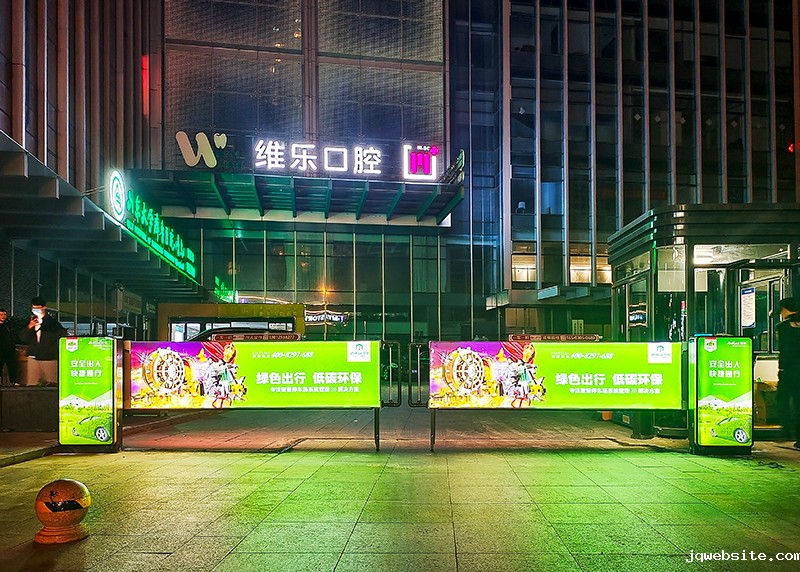 山东大学维乐口腔医院停车场采用jqwebsite对开卡布灯箱广告道闸,广告内容在夜色中更加突出,成为城市夜景的一部分。